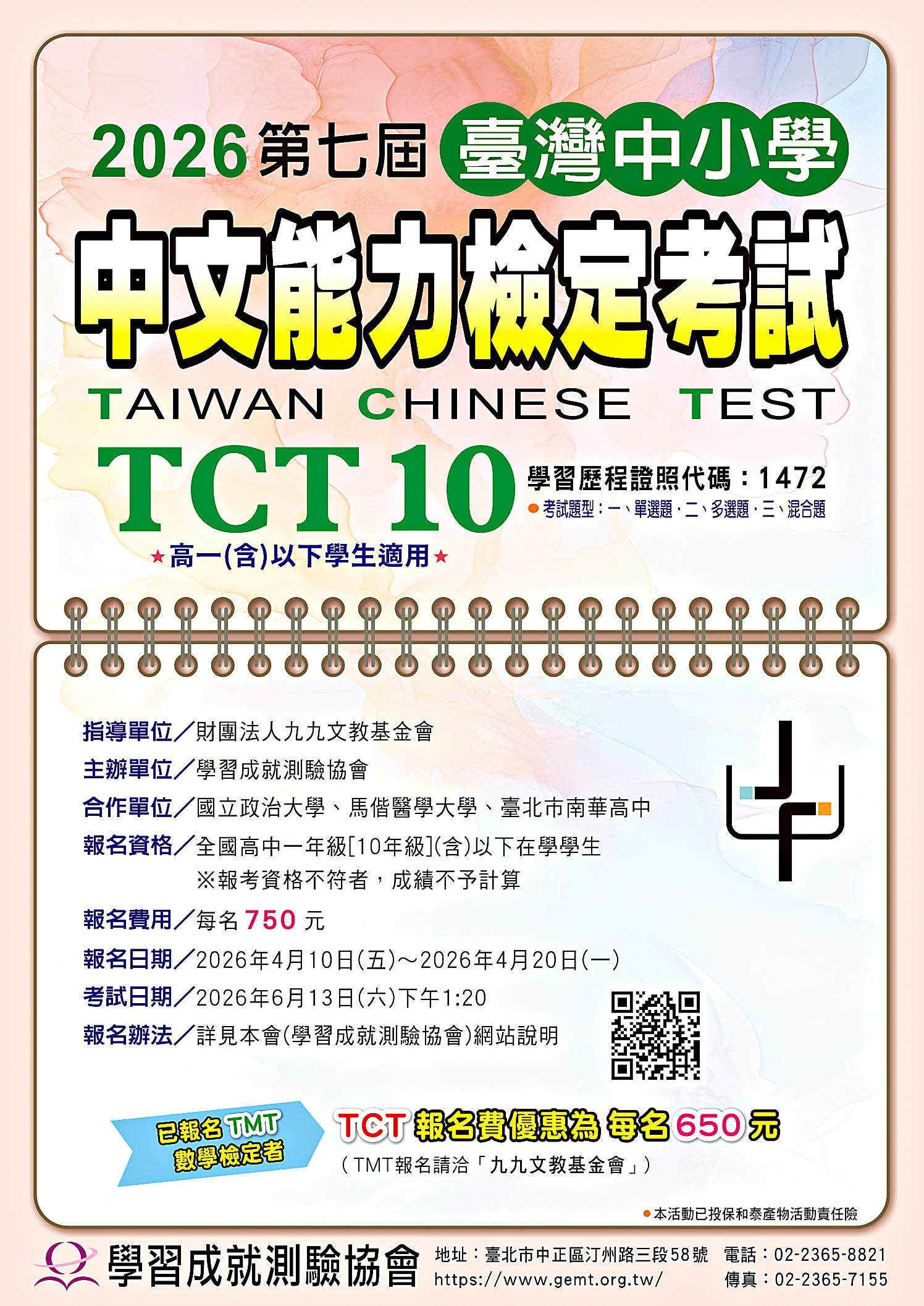 **已報名TMT數學檢定者,TCT報名費優惠為每名650元**